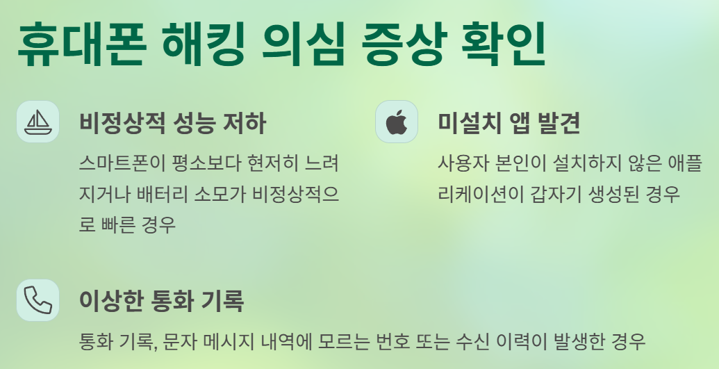 휴대폰이 갑자기 느려지거나, 배터리가 비정상적으로 빨리 닳거나, 모르는 앱이 설치되어 있다면 휴대폰 해킹이 의심될 수 있습니다. 특히, 통화 기록이나 문자 내역에서 낯선 흔적이 있다면 더욱 주의해야 합니다. 이런 휴대폰 해킹 증상은 개인정보 유출이나 금융 피해로 이어질 수 있어 조속한 확인이 필요합니다.